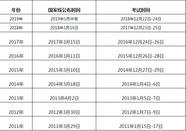 2019考研國家線什么時(shí)間公布?預(yù)計(jì)3月中旬左右??忌橥攴?jǐn)?shù),國家線發(fā)布之前,建議安心備戰(zhàn)復(fù)試調(diào)劑,早做打算。以下是歷年國家線的發(fā)布時(shí)間: