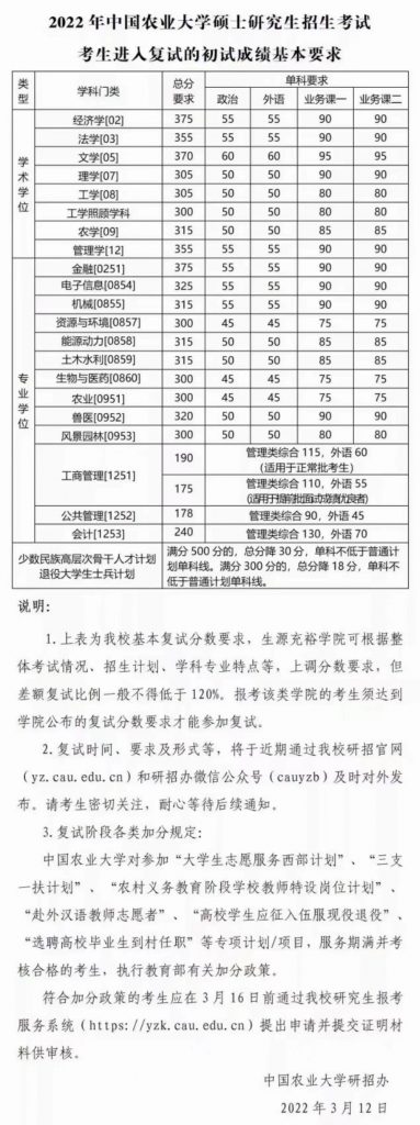 2022年中國(guó)農(nóng)大研考復(fù)試基本分?jǐn)?shù)線發(fā)布院校動(dòng)態(tài)