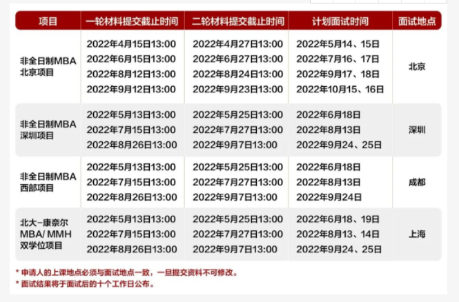 2· 2023年非全日制MBA深圳、西部項目、北大-康奈爾MBA/MMH雙學位項目的一輪材料提交最終截止時間為2022年8月26日13:00,二輪材料提交最終截止時間為2022年9月7日13:00。